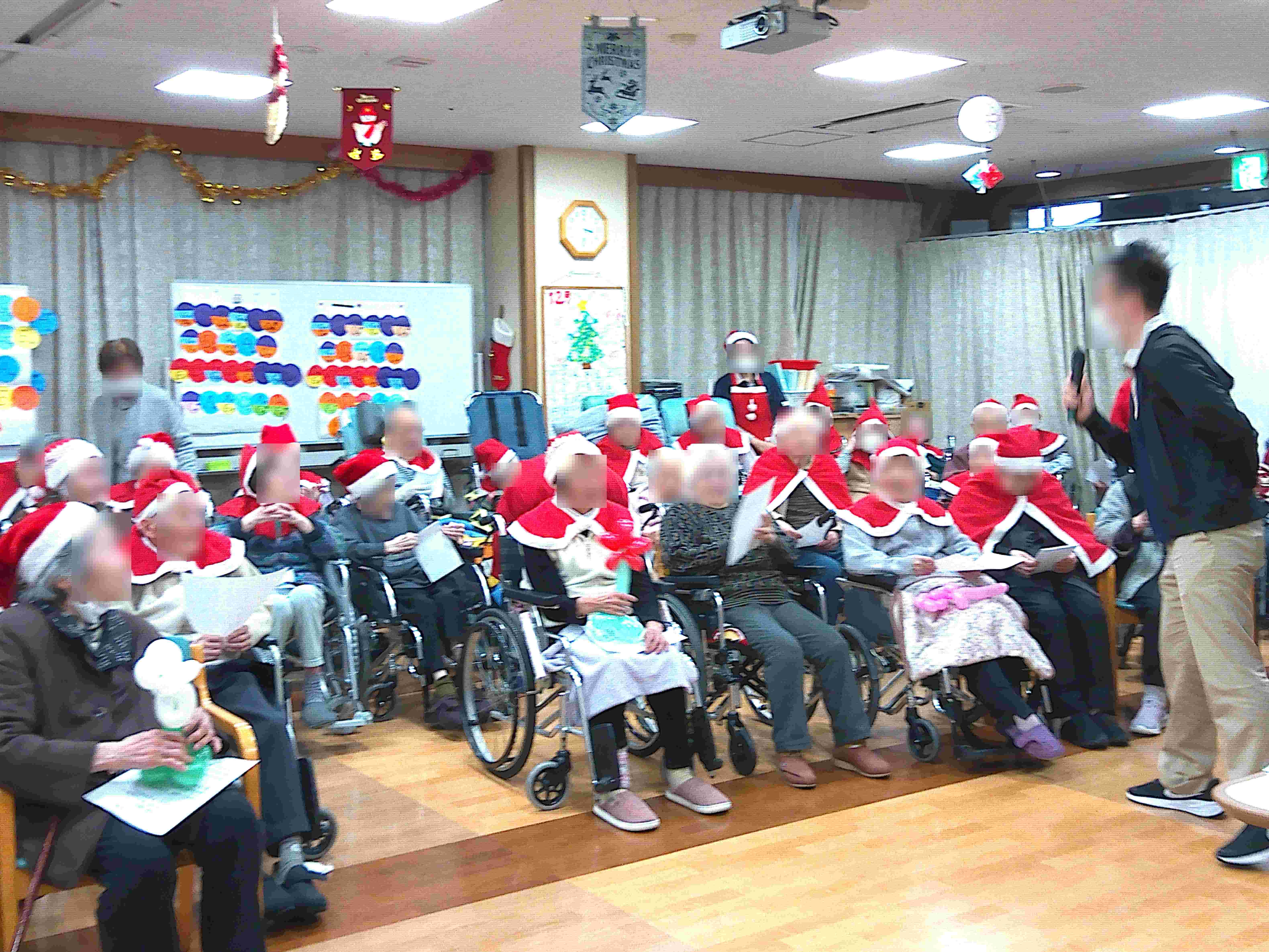 クリスマス会 「クリスマス会」 特養でクリスマス会を開催しました。 職員によるダンスやジェスチャーゲーム、利用者様全員でのクリスマスソングなど、さまざまな催し物を行いました。 どれも大変盛況で、楽しんでいただけたようです。
